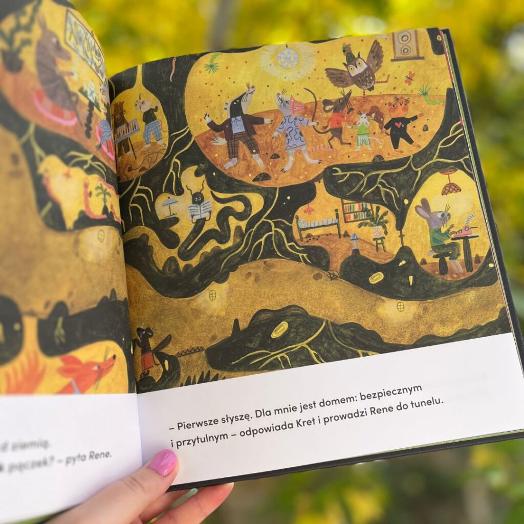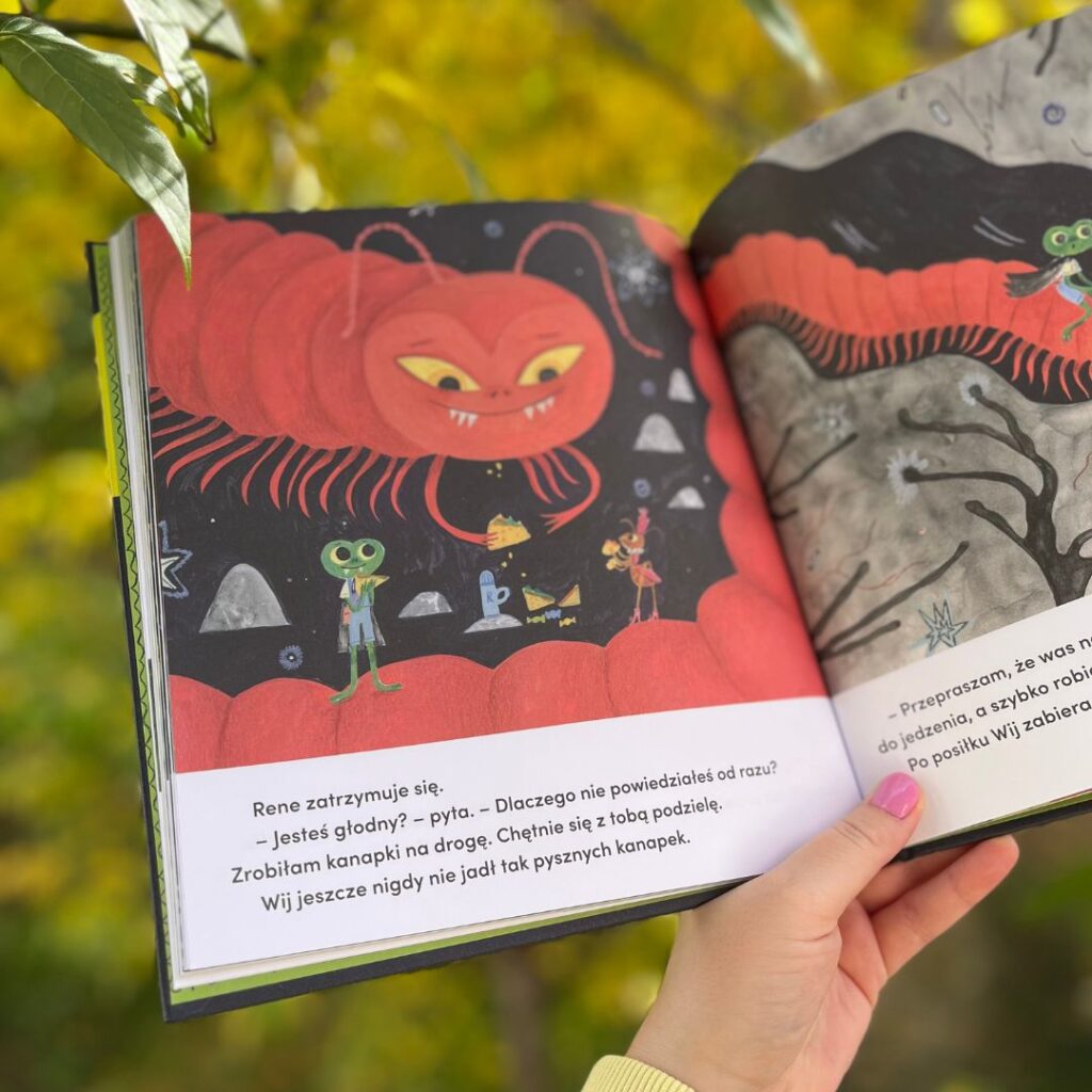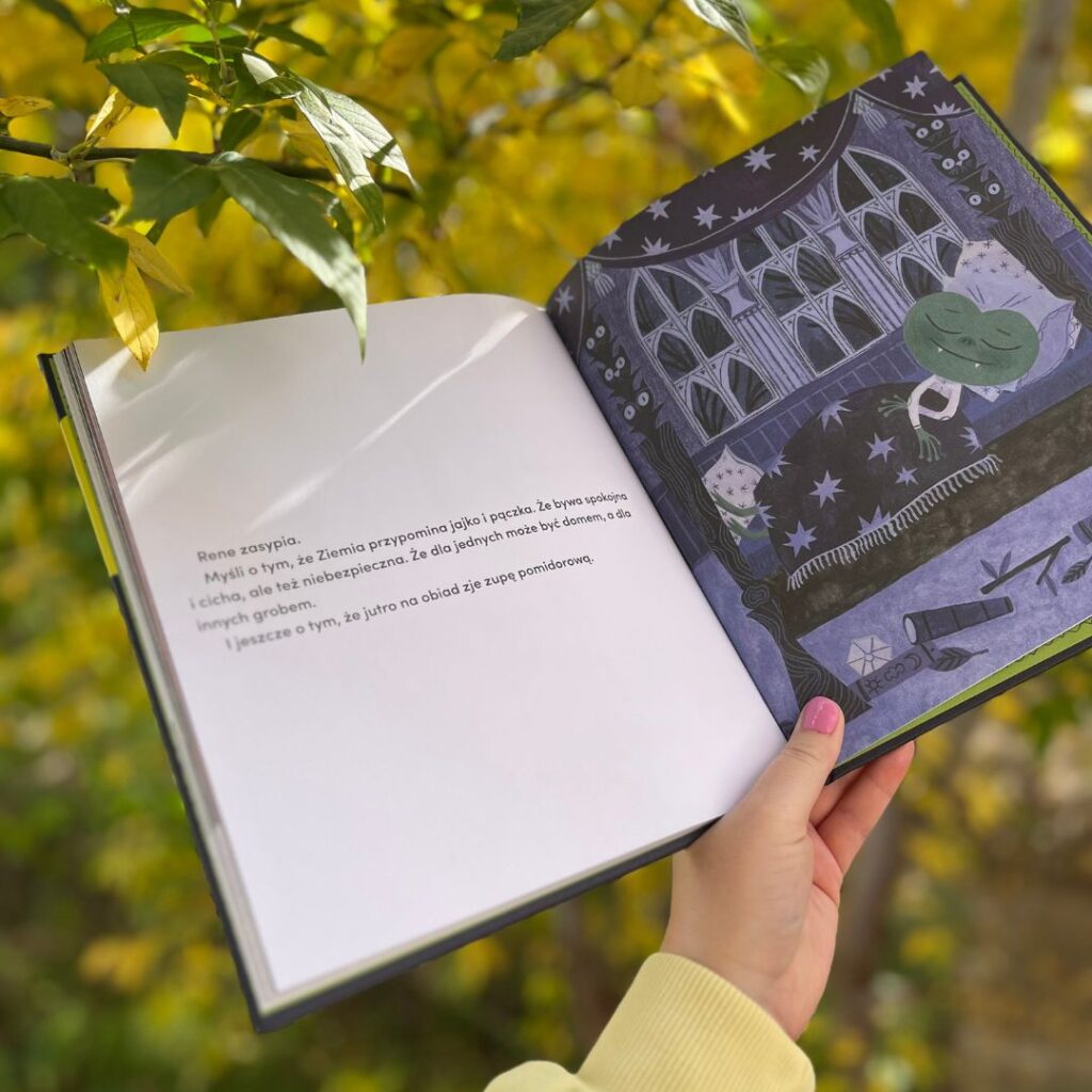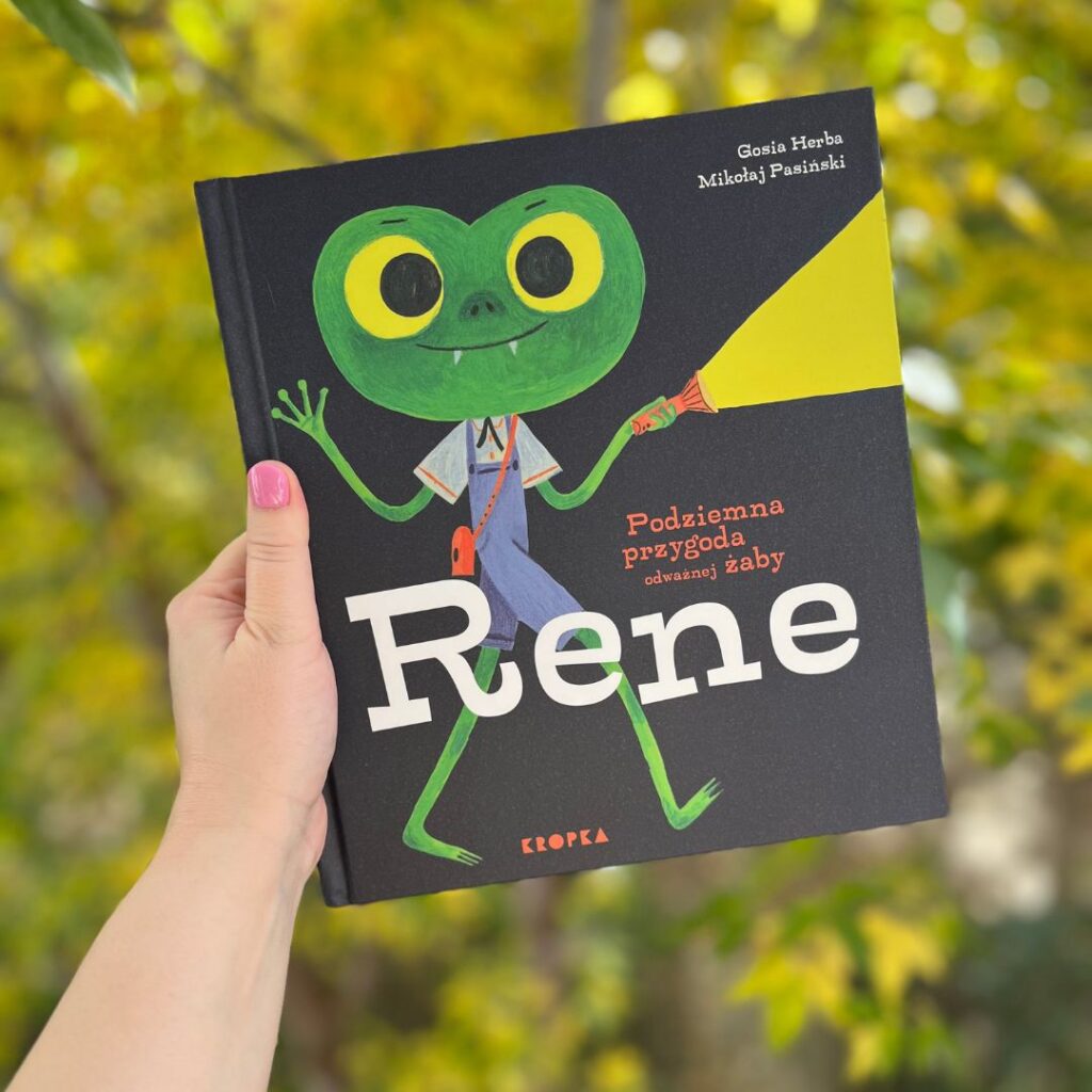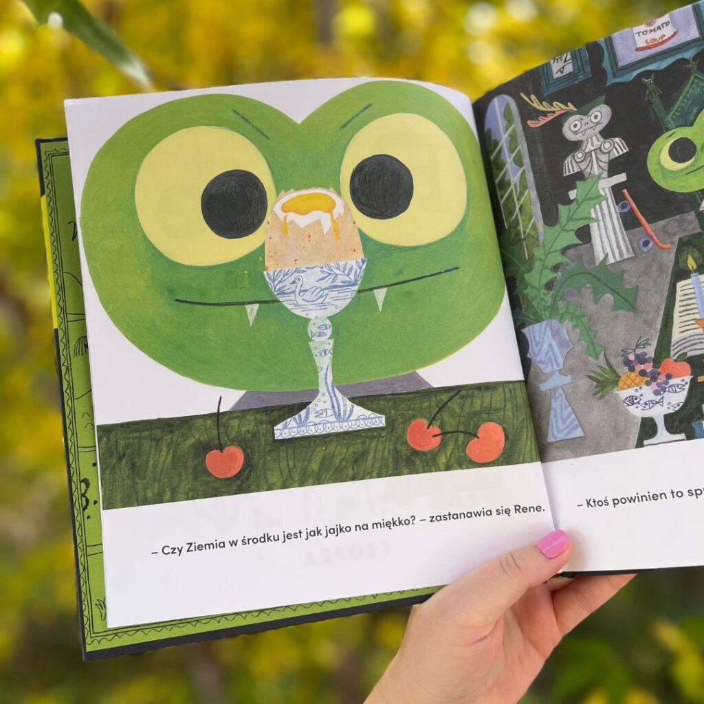 Zacznijmy od tego, kim jest tytułowa bohaterka, czyli Rene? To odważna i ciekawa świata żaba, która zadaje pytania i nie boi się ruszyć w nieznane. Co prawda Rene jest wampirkiem (świadczą o tym zęby, peleryna i wystrój domu), ale spokojnie – żabka jest bardzo przyjazna, a opowieść interesująca i ciepła.